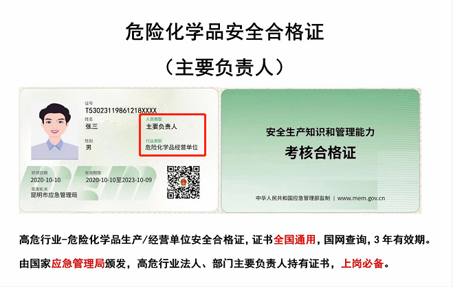 危险化学品生产经营经营单位主要负责人和安全生产管理人员经考核合格后,由应急管理局统一核发《安全生产知识和管理能力考核合格证》,证书有效期为3年,有效期满前60日内,需申请换证考核。